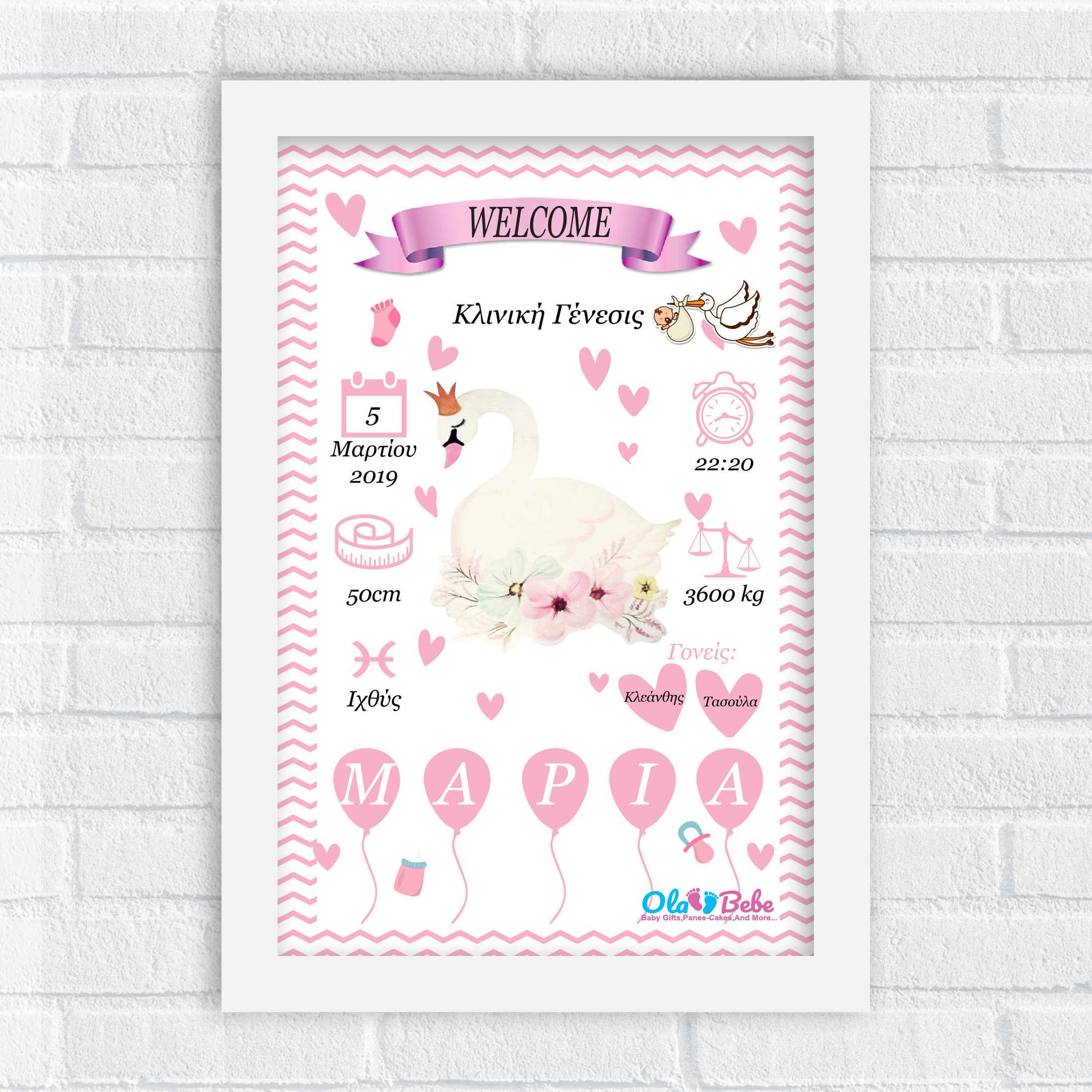 Ένα όμορφο αναμνηστικό Καδράκι Γέννησης με σχέδιο τον Κύκνο για το μωράκι και την μανούλα! Καδράκι Ενθύμιο γέννησης με τα στοιχεία γέννησης του μωρού!