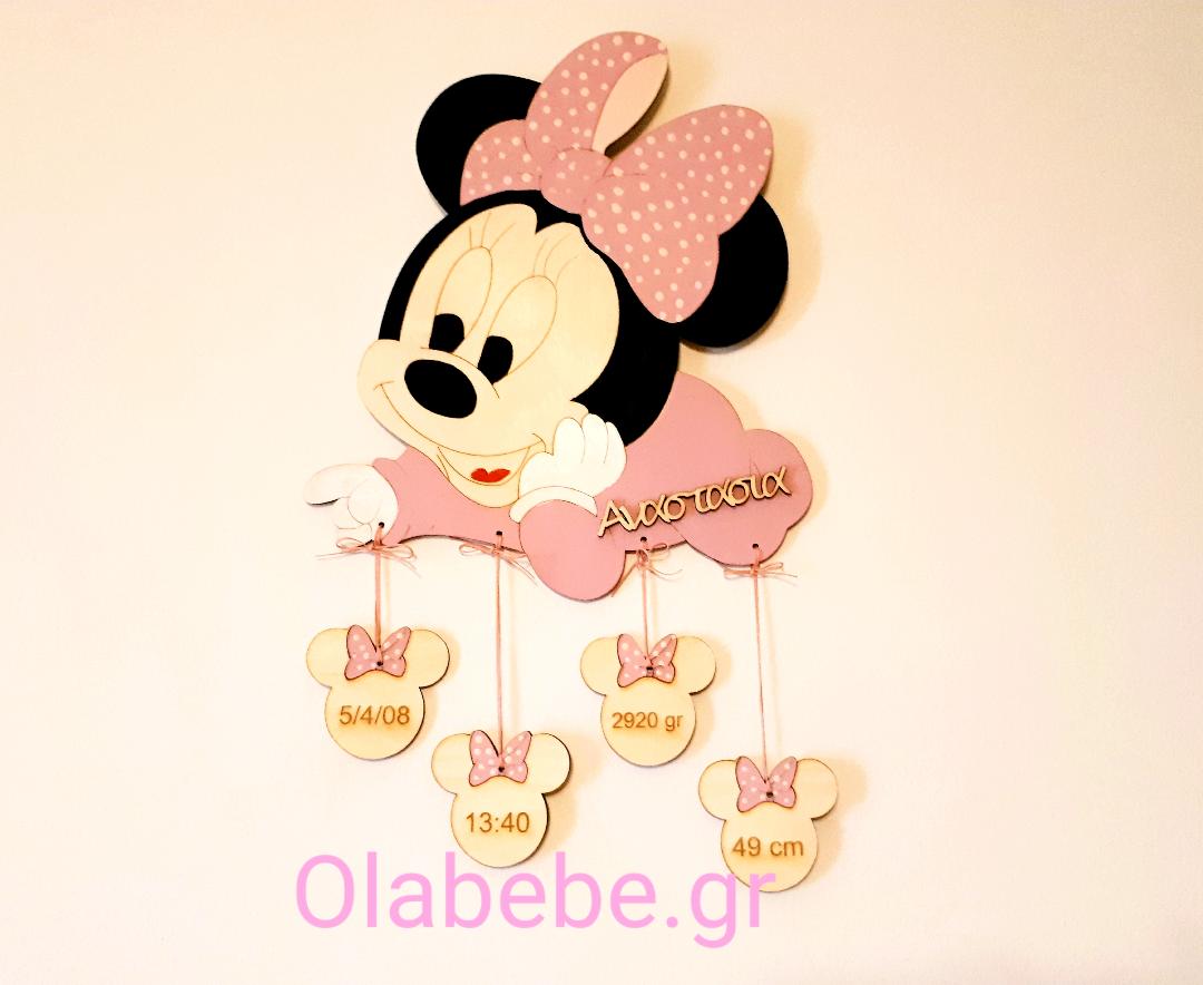 Ξύλινο διακοσμητικό με την Μίνι Μάους και τα στοιχεία γέννησης του παιδιού.