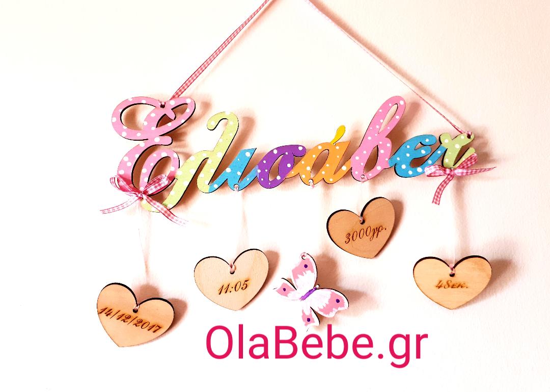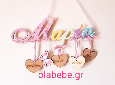 Ξύλινο διακοσμητικό με το όνομα και τα στοιχεία γέννησης του παιδιού.