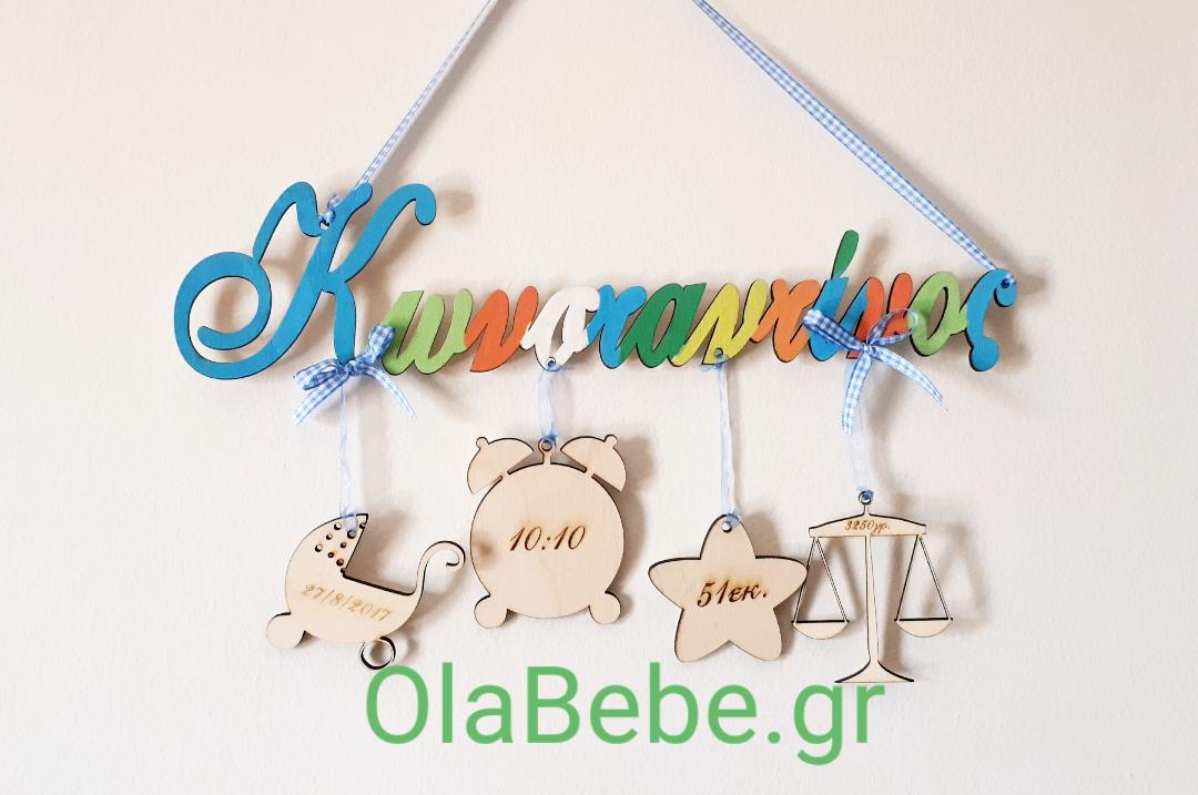 Ξύλινο διακοσμητικό με το όνομα και τα στοιχεία γέννησης του παιδιού.
