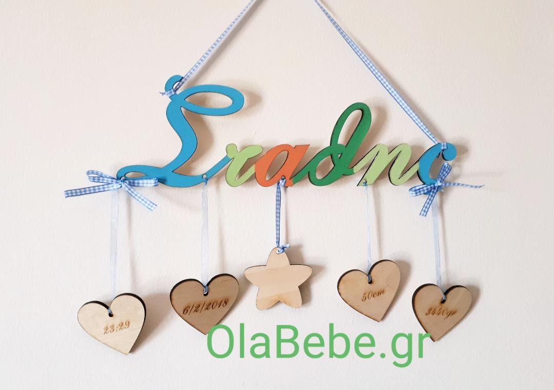 Ξύλινο διακοσμητικό με το όνομα και τα στοιχεία γέννησης του παιδιού.