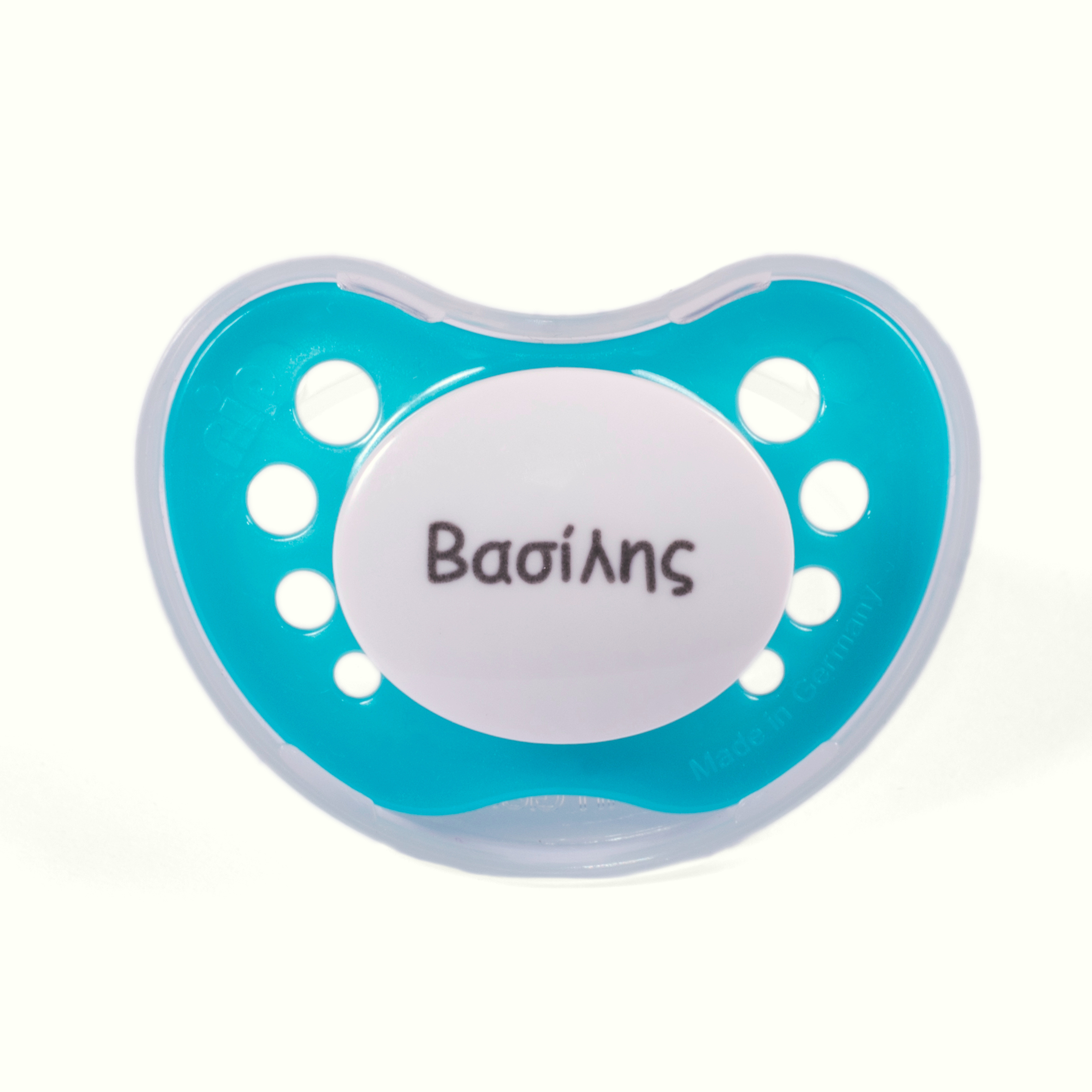Πιπίλα με όνομα σε Σιέλ χρώμα.