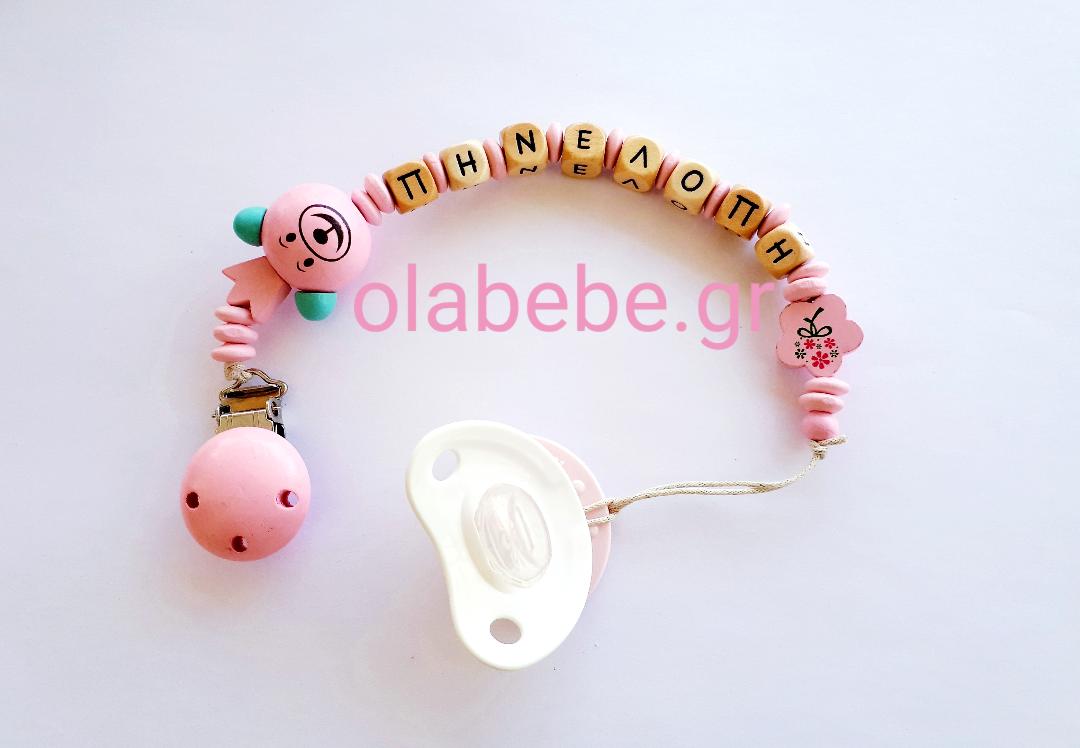 Πιπιλοπιάστρα με όνομα με ξύλινα χαρακτηριστικά σε ροζ απόχρωση.